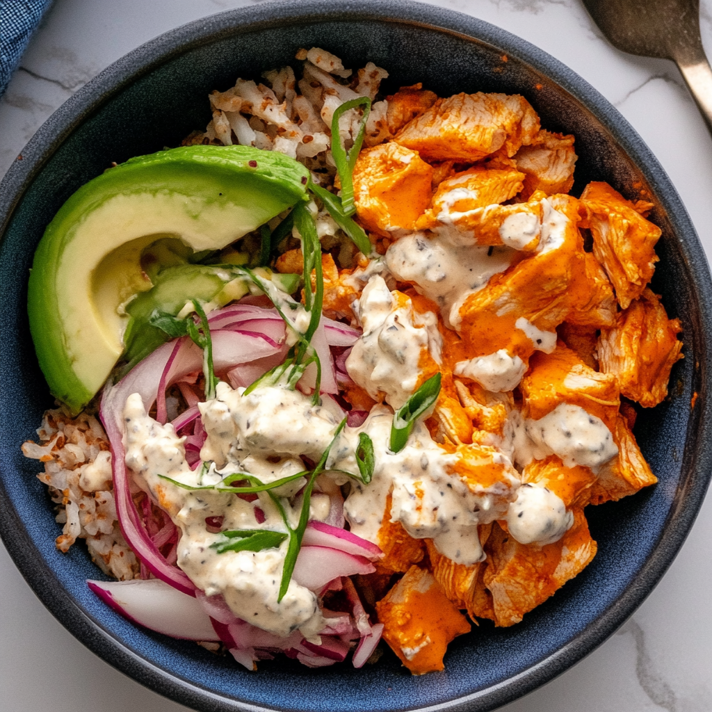 Divide the rice mixture into serving bowls. Top each bowl generously with sliced chicken, avocado slices, crumbled blue cheese, and a drizzle of buffalo sauce for that spicy kick.