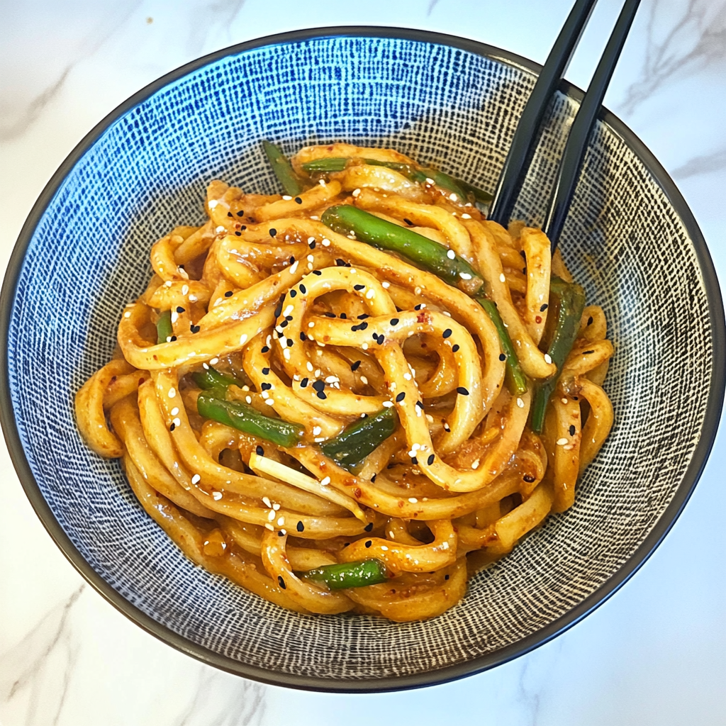 Now it’s time for the star of the show! Add your cooked udon noodles directly into the pan with that creamy gochujang sauce. Toss them gently until every strand is coated beautifully. This mixing ensures every bite is flavorful.
