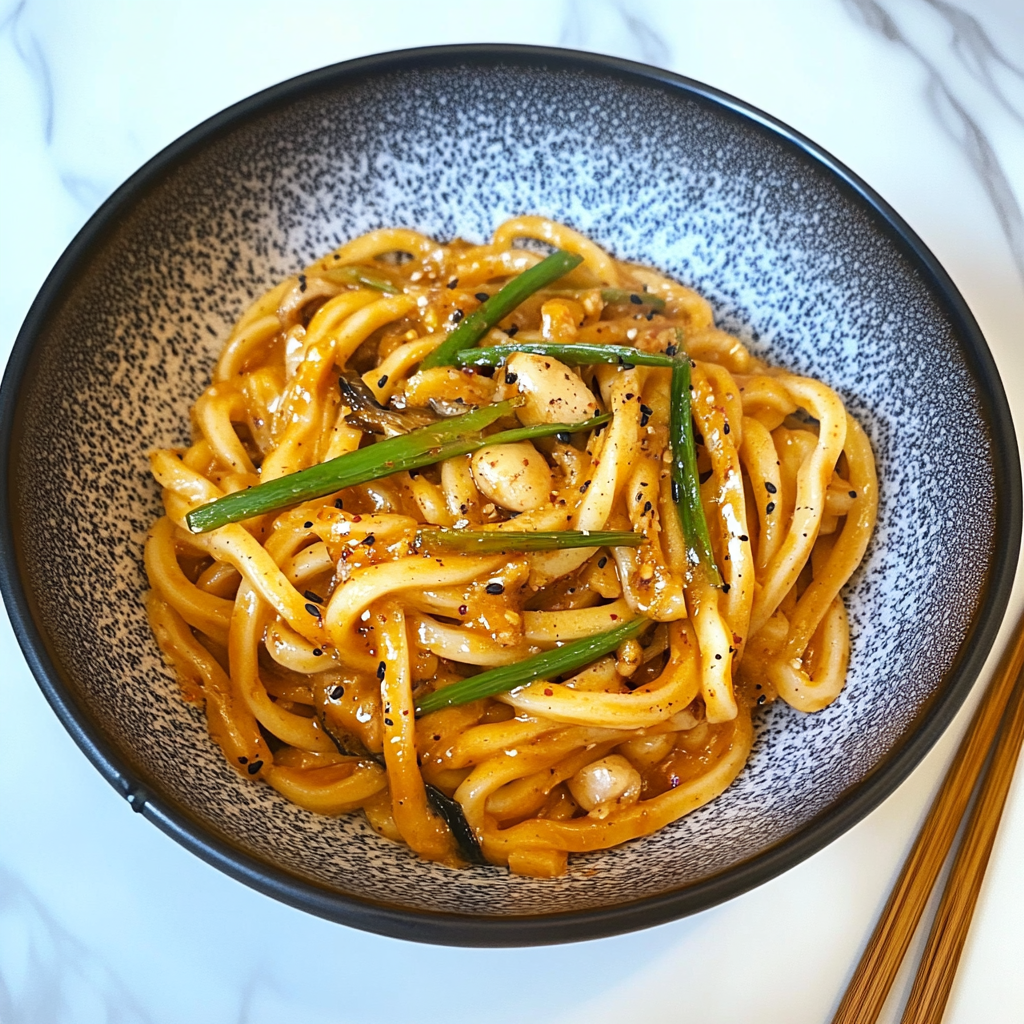 5. Toss cooked udon noodles in the sauce until evenly coated. Serve hot garnished with chopped green onions.
