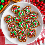 - Remove from the oven and gently press a matching pretzel onto each melted candy. Sprinkle with colorful Christmas sprinkles before cooling completely.