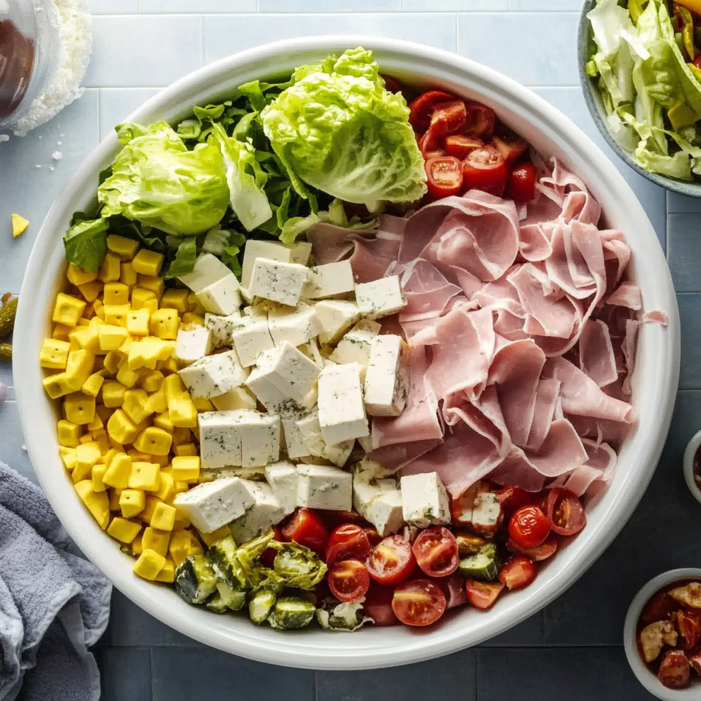 Next, layer in your toppings! Start with the crispy crumbled bacon, followed by firm diced tomatoes, tangy banana peppers, and crunchy pickles. Finally, add in a hearty mix of diced chicken ham and diced turkey. This combination will create a vibrant medley of flavors and textures.